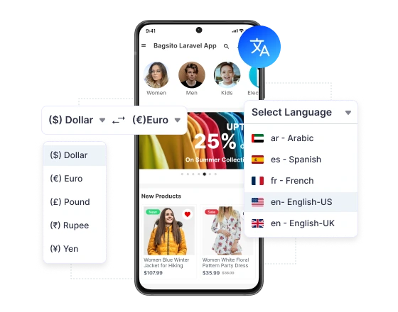 Açık Kaynaklı eTicaret uygulaması tam çoklu yerel desteği sağlar. Bu özellik, uygulama deneyimini ana dilinizde sunar ve yerel para biriminizle satın alma işlemi yapar. Uygulama, mağazayı gerekli yerel ayarda kolayca dönüştürür.